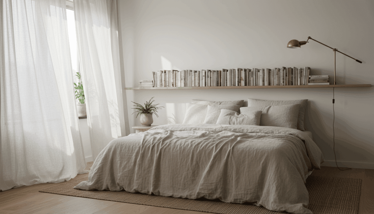 Poucos objetos deixam o quarto tão convidativo quanto livros bem posicionados. Uma pilha discreta no criado-mudo, acompanhada de uma luminária, transforma o espaço num refúgio de calma.