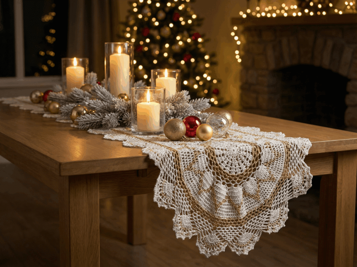 A base pode ser aquele modelo que você já vende o ano todo; o toque de Natal vem nos detalhes: aplicação de árvore, estrela, sino ou Papai Noel em crochê. É uma peça barata, rápida e perfeita para kits de presente. - Caminho de mesa em crochê com “toque de luxo”