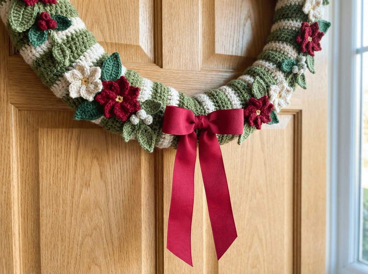 Em vez de fazer a almofada toda temática, produza capas lisas (em pontos básicos) e aplique um motivo de Natal removível (como um granny square natalino ou um Papai Noel em relevo). Assim, seu cliente usa a almofada o ano todo e troca só o detalhe. - Guirlanda de porta com base de crochê