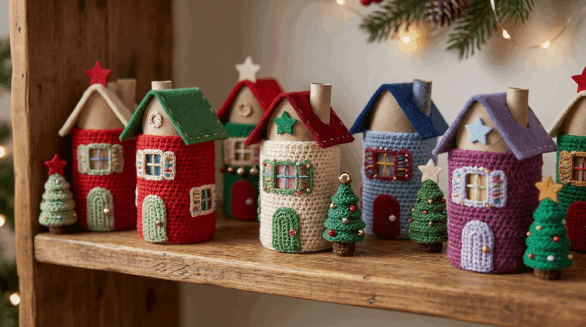 Use aro de isopor, MDF ou arame como base e envolva com cordão de crochê ou tiras em ponto baixo. Complete com flores, folhas, laços e mini-enfeites em crochê. O resultado é leve, durável e muito fotogênico. - Mini casinhas de Natal com tubos de papel higiênico e crochê