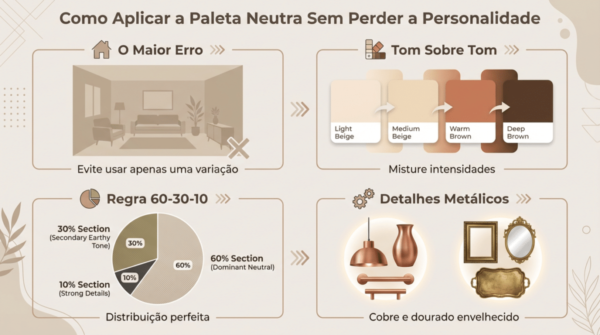 O maior erro na decoração neutra é usar apenas uma variação de cor. Para um visual moderno, é essencial trabalhar com o “tom sobre tom”. Misturar diferentes intensidades de bege e marrom cria profundidade visual e evita que o cômodo pareça “achatado” ou sem vida.