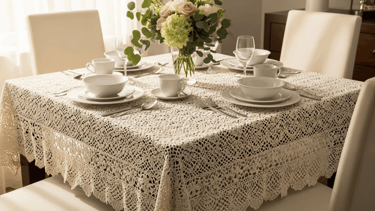 - Toalha de crochê quadrada: ideal para mesas maiores, traz equilíbrio e elegância à composição.