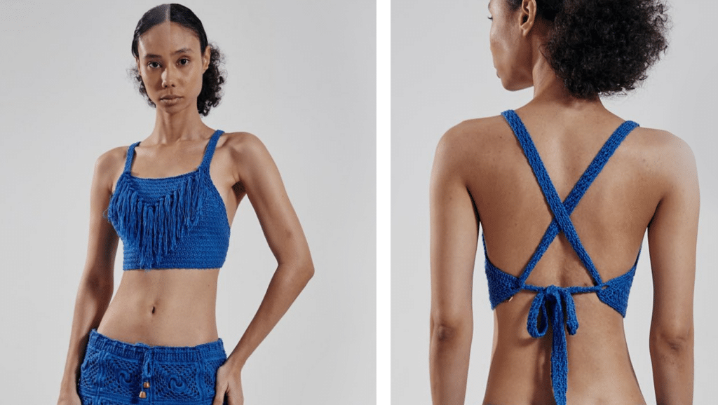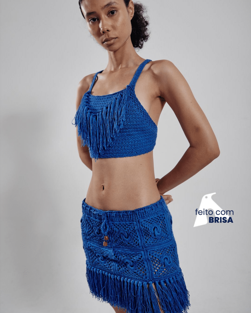 A cor azul bic é mais do que apenas uma escolha estética para o Conjunto “Caminho das Águas”; é uma declaração de estilo. Essa tonalidade profunda e rica evoca uma sensação de serenidade e sofisticação, elevando instantaneamente o visual da peça. O azul bic adiciona um toque de modernidade e frescor, enquanto mantém a elegância clássica que o crochê proporciona, criando uma combinação perfeita entre tradição e contemporaneidade.