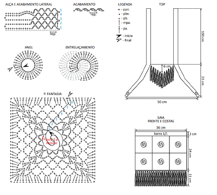 TOP: Comece pelo decote. Faça 32 corr., mais 3 corr. para subir a carr., 1 pa. laçando a 5ª corr a contar da ag., 1 pa. em cada corr. seguinte até o final do cordão. Trab. carr. de ida e volta em pa. iniciando e terminando cada uma com 2 pa. na mesma base 10 x e 3 pa. na mesma base 12 x. Para finalizar, trab. uma carr. com 1 pb., *3 corr., pule 2 p. da base, 1 pb. no p. seguinte*. Arrem..