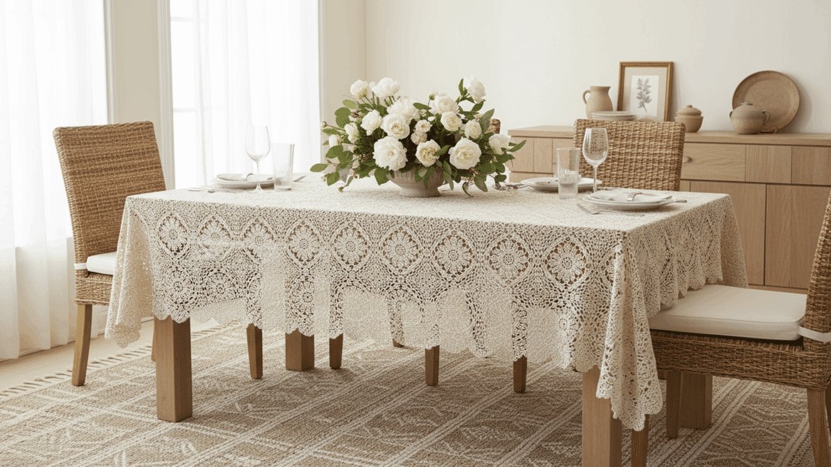 - Modelos em crochê filet: desenhos geométricos e florais feitos com pontos abertos, ideais para salas de jantar elegantes.