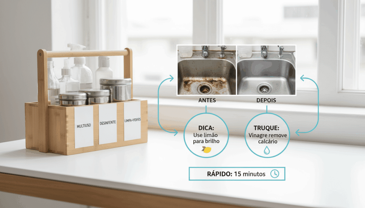 Limpar bem não é passar horas esfregando; é seguir uma sequência inteligente com os produtos certos. Comece sempre de cima para baixo — luminárias, prateleiras, superfícies e, por último, o piso — para não refazer trabalho. Prefira microfibra (segura mais pó que pano comum), use luvas e mantenha uma caixa de limpeza à mão. Antes de testar qualquer mistura, faça prova em área discreta e ventile o ambiente. A partir daqui, você tem um roteiro contínuo por cômodo, três listas-base e checklists rápidos que se encaixam na rotina.