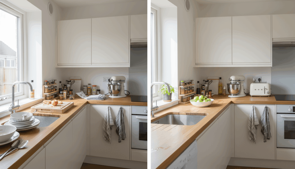 A cozinha limpa nasce da manutenção diária. Terminou a louça? Aproveite a espuma para esfregar cuba e bancada; enxágue e seque. O fogão de inox volta a brilhar com detergente neutro, enxágue e uma gota de óleo mineral no pano para finalizar. Filtros do exaustor desengorduram após 15 minutos em água quente + detergente desengordurante; enxágue e seque. Para o micro-ondas, copo com água + rodelas de limão por 3 minutos: o vapor solta a sujeira e você só passa o pano. A geladeira perde odores com água morna + bicarbonato; seque bem e deixe carvão ativado (ou café) em pote aberto.