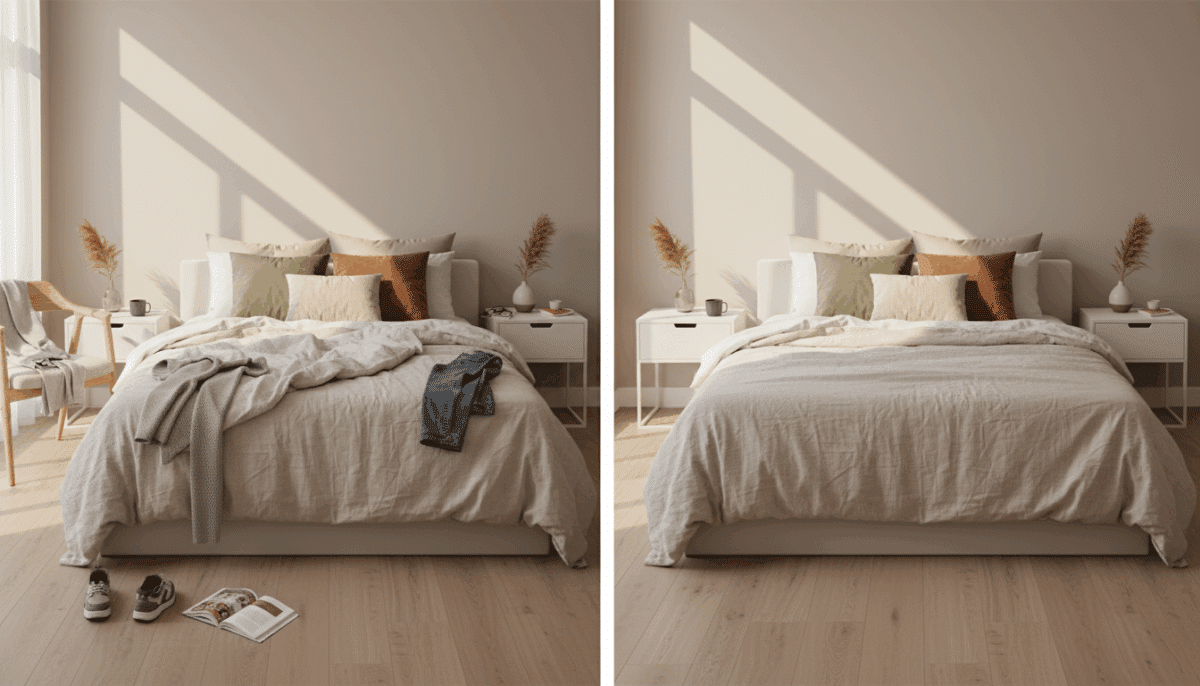 Cama feita e mesa de cabeceira vazia mudam o humor do quarto. Trocar a roupa de cama semanalmente e aspirar debaixo da cama evita pó acumulado. Mantenha um spray de lençóis suave (borrife no pano, não direto) para sensação de frescor.