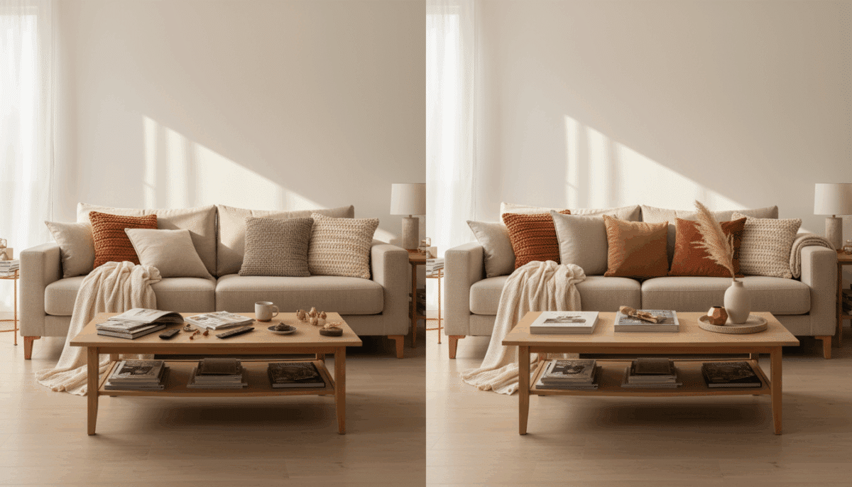 A sala “respira” quando você arruma almofadas, dobra a manta e limpa superfícies de uso. Um minuto de ajuste no tapete (pés da frente do sofá sobre ele) muda a proporção visual. Se quiser elevar rápido, use abajur de luz quente e monte uma vinheta com 3 alturas (livro, vaso, objeto).