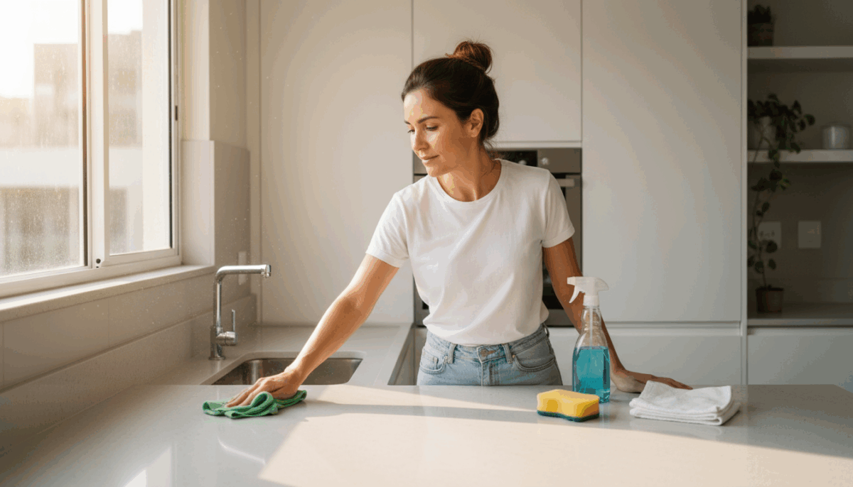 Mulher limpando bancada de cozinha minimalista com pano; borrifador ao lado e luz natural da janela.— Imagem ilustrativa gerada por IA, criada sob licença paga para uso exclusivo do site Katia Ribeiro. Todos os direitos de utilização reservados.