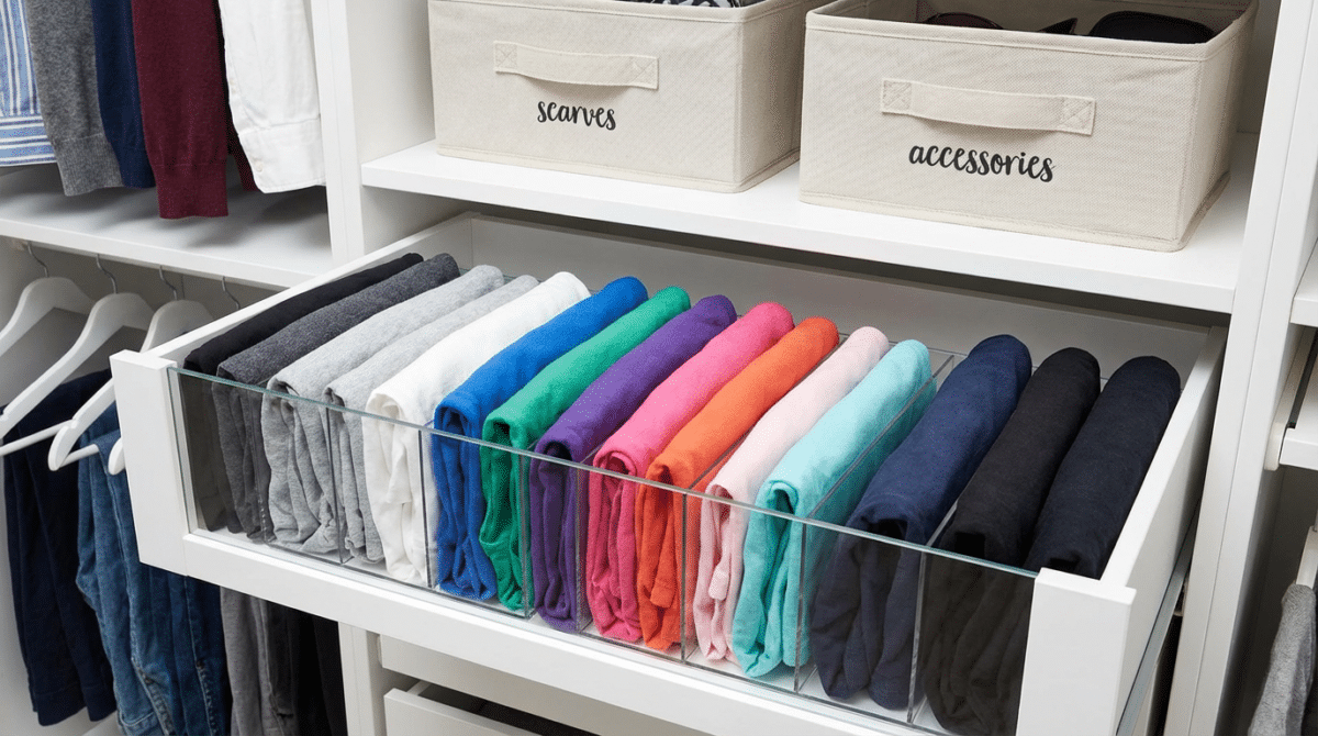 Blusas, camisetas e roupas de malha podem ser dobradas no formato de “retângulo” e colocadas em pé, lado a lado, em vez de empilhadas. Isso evita montes altos que desmoronam e permite ver todas as peças de uma vez, reduzindo a sensação de bagunça.