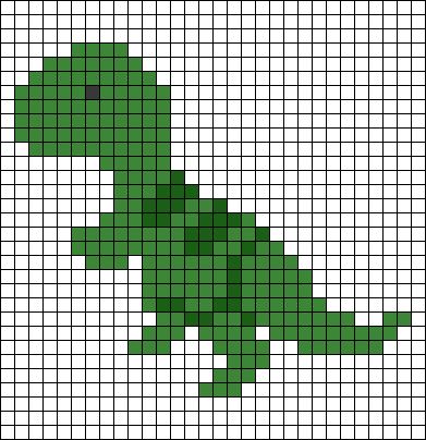 - Gráfico de dinossauro em ponto cruz, que pode ser encontrado online ou em revistas especializadas. O gráfico é uma representação do desenho em quadrados coloridos, onde cada quadrado representa um ponto no tecido.