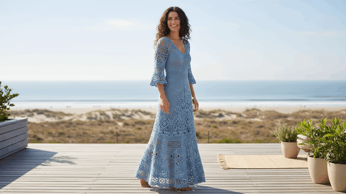 Dica de estilo: os vestidos de crochê combinam muito bem com jaquetas jeans, cintos finos e bolsas pequenas, criando um equilíbrio entre o artesanal e o urbano.