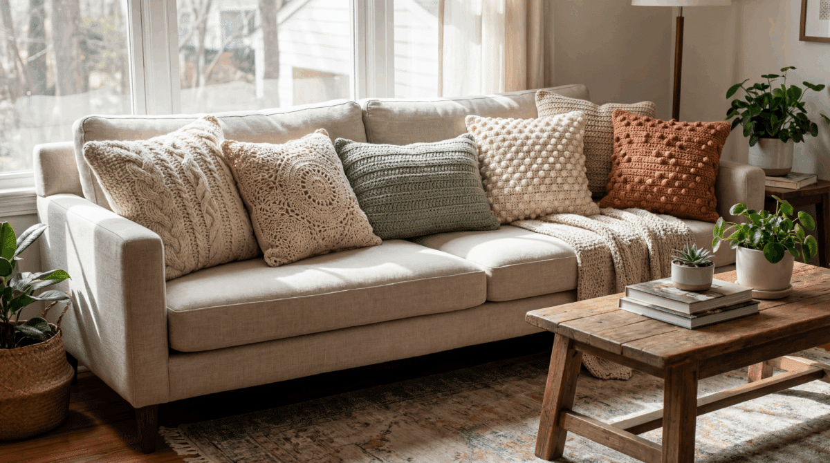 O segredo não é encher o sofá de almofada, e sim escolher algumas capas de crochê coringas, em cores bem pensadas e pontos bonitos, que conversem com a decoração e ainda possam ser facilmente trocadas conforme a estação ou a vontade de mudar.