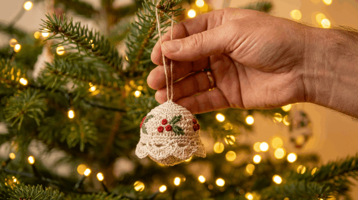 Como todo trabalho manual, os enfeites de Natal de crochê merecem cuidado para durarem vários anos. Assim, cada Natal vai ganhando camadas de história – e você não precisa refazer tudo a cada temporada.