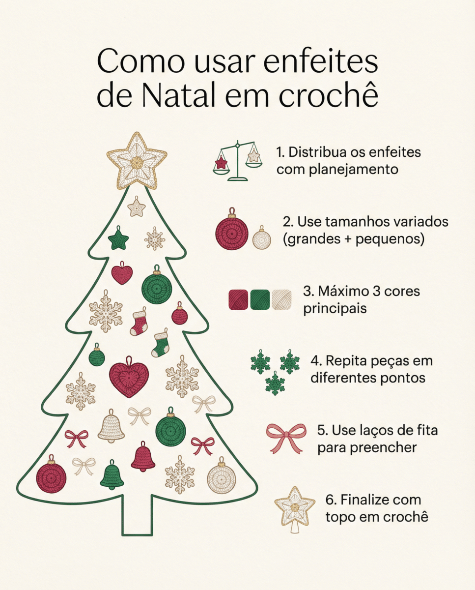Use enfeites em tamanhos diversos, intercalando peças maiores (como bolas e estrelas) com menores (como floquinhos e corações). O crochê, por ter textura, já chama bastante atenção, então não é necessário lotar cada galho; o efeito fica mais sofisticado quando há espaço para a árvore “respirar”.