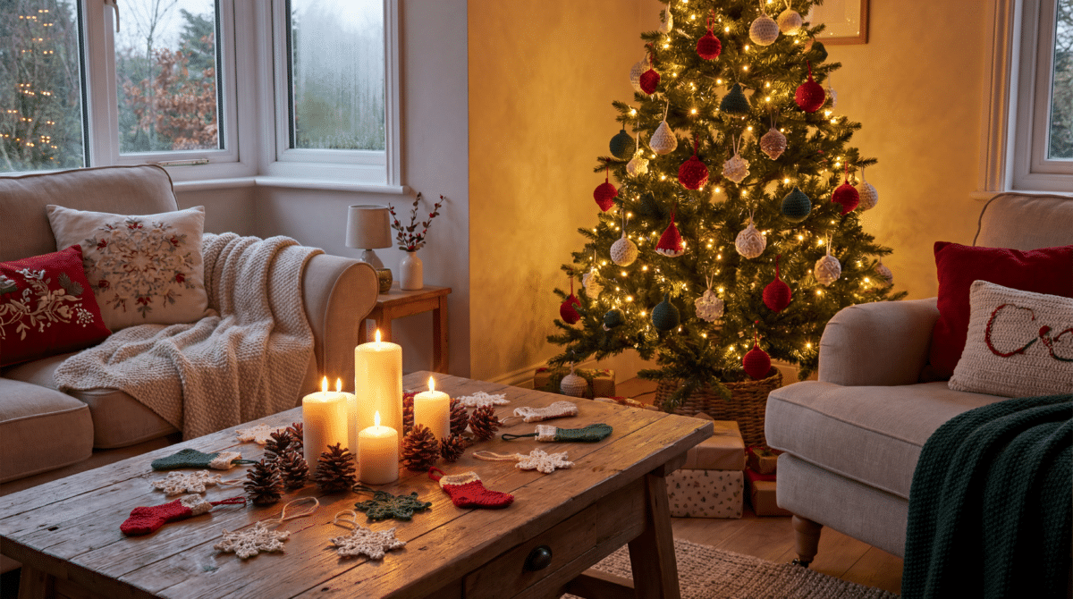 Os enfeites de Natal em crochê não precisam ficar restritos à árvore. Eles podem aparecer em vários cantinhos, criando um fio condutor discreto pela casa.