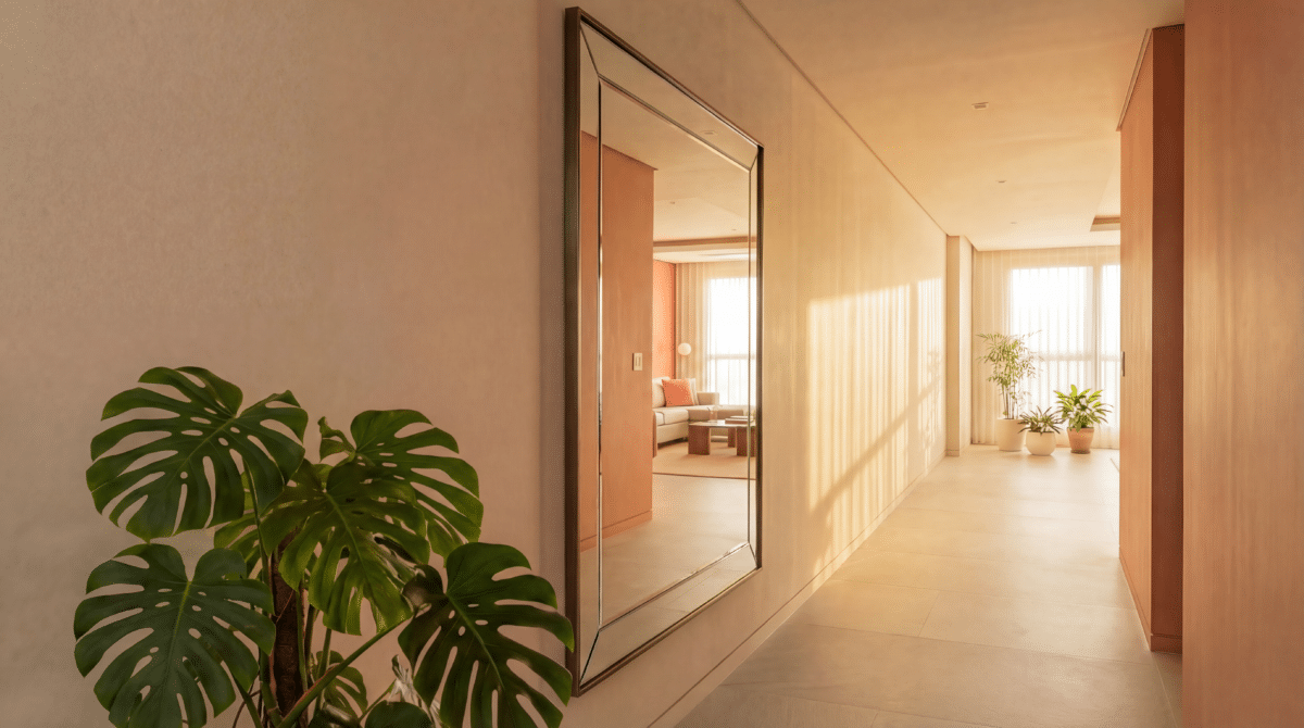 - Paredes opostas a portas abertas: Se um quarto recebe muito sol, o espelho no corredor deve estar alinhado com essa porta para “puxar” a claridade para fora.