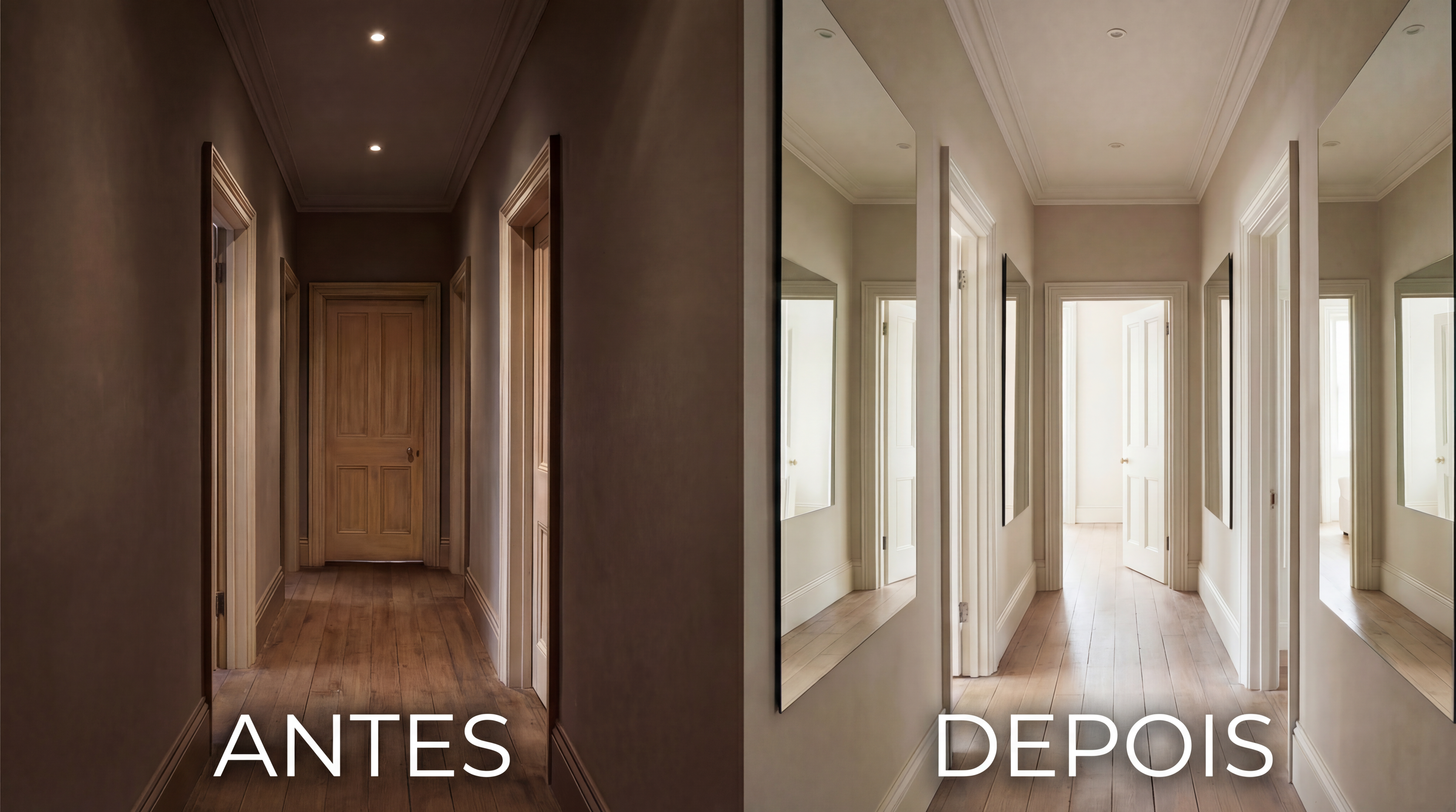 Espelhos sem moldura (estilo bisotê) são excelentes para um visual moderno e limpo, pois permitem que a transição entre o reflexo e a parede seja fluida. Essa continuidade visual é o que garante que o corredor pareça não apenas mais claro, mas significativamente mais largo.