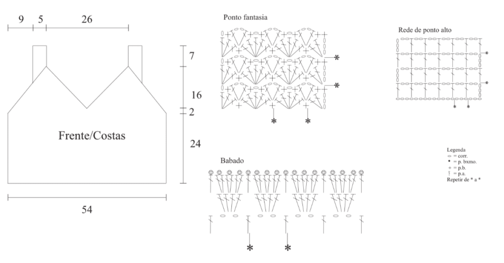 Primeiramente, para a frente/costas da blusinha, são iguais e trabalhadas juntas. Lado direito – frente – Comece pela ponta do decote. Faça uma corr. de 5 p. e trabalhe em p. fantasia seguindo o gráfico. Ademais, comece com uma vez de * a *. Para a cava aum. à direita em cada carr.: 1 p. (24 v.) e 2 p. (12 v.). Ao mesmo tempo, para o decote, aum. à esquerda em cada carr.: 1 p. (19 v.) e 2 p. (13 v.). Terminado os aum., deixe em espera