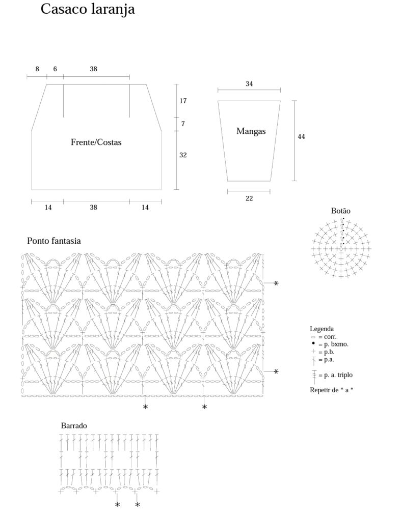 Mangas – Trabalhe em p. fantasia seguindo o gráfico, diretamente na cava, repita de * a * do gráfico no sentido dos p. (6 v.). Dim. na direção da cava cada em cada carr.: 1 p. (22 v.). A 40 cm do início da manga trabalhe o barrado seguindo o gráfico. Terminado o gráfico rem.. Botão – Faça uma corr. de 3 p. feche em círculo e trabalhe o botão seguindo o gráfico. Faça 4 botões iguais.