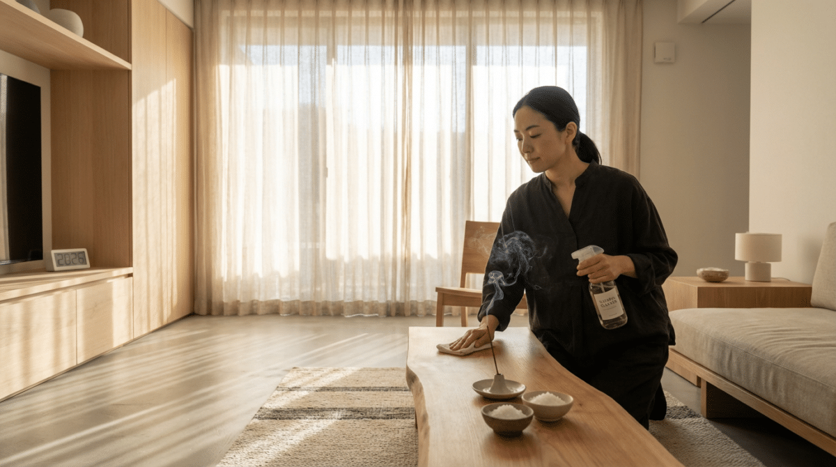Esqueça apenas os produtos químicos fortes. No ritual do Oosouji, o uso de elementos naturais é comum para a purificação. O vinagre é excelente para remover gorduras e bactérias, enquanto o sal é usado simbolicamente em pequenos potes nos cantos da casa para absorver vibrações pesadas. Essa abordagem de limpeza ecológica protege a saúde da sua família e o meio ambiente.