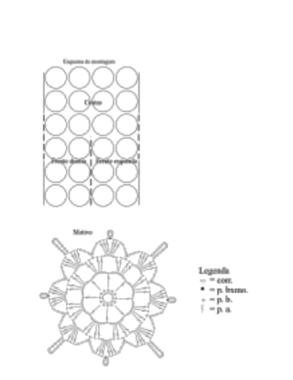 Faça uma corr. de 8 p. feche em círculo e trabalhe o motivo seguindo o gráfico. Terminado o gráfico rem.. Agora confeccionar 24 motivos iguais unindo-os entre si durante a última carr. seguindo o esquema de montagem. Deixe os motivos soltos nas linhas pontilhadas no esquema de montagem, para as cavas e abertura da frente. Faça 17 pingentes com 30 fios (dobrado 60 fios) e 20 cm (10 cm dobrado) de comprimento e prenda nas pontas dos motivos da parte inferior do colete.
