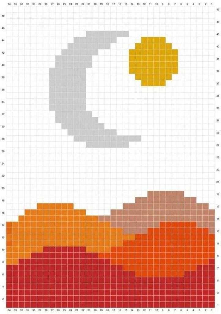 Ademais, na 66ª carr.: 5 pb. com o fio Amigurumi 3148 (Macadâmia), 9 pb. com o fio Amigurumi 4146 (Gema), 36 pb. com o fio Amigurumi 3148 (Macadâmia) = 50 pb. 67ª carr.: 35 pb. com o fio Amigurumi 3148 (Macadâmia), 11 pb. com o fio Amigurumi 4146 (Gema), 4 pb. com o fio Amigurumi 3148 (Macadâmia) = 50 pb. 68ª carr.: 4 pb. com o fio Amigurumi 3148 (Macadâmia), 11 pb. com o fio Amigurumi 4146 (Gema), 35 pb. com o fio Amigurumi 3148 (Macadâmia) = 50 pb.; 69ª carr.: 35 pb. com o fio Amigurumi 3148 (Macadâmia), 11 pb. com o fio Amigurumi 4146 (Gema), 4 pb. com o fio Amigurumi 3148 (Macadâmia) = 50 pb.;