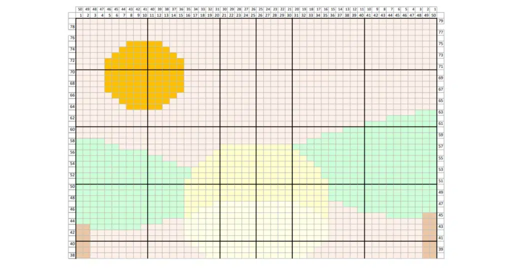 Então, 24ª à 26ª carr. (3 carreiras): 2 pb. com o fio Amigurumi 7148 (Craft), 17 pb. com o fio Amigurumi 3148 (Macadâmia), 12 pb. com o fio Amigurumi 1730 (Amarelo-Candy), 17 pb. com o fio Amigurumi 3148 (Macadâmia), 2 pb. com o fio Amigurumi 7148 (Craft) = 50 pb.; 27ª à 29ª carr. (3 carreiras): 2 pb. com o fio Amigurumi 7148 (Craft), 18 pb. com o fio Amigurumi 3148 (Macadâmia), 10 pb. com o fio Amigurumi 1730 (Amarelo-Candy), 18 pb. com o fio Amigurumi 3148 (Macadâmia), 2 pb. com o fio Amigurumi 7148 (Craft) = 50 pb.;