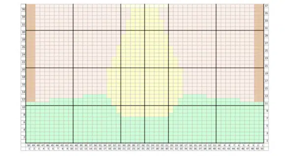 Então, na 41ª e 42ª carr.: 2 pb. com o fio Amigurumi 7148 (Craft), 13 pb. com o fio Amigurumi 3148 (Macadâmia), 20 pb. com o fio Amigurumi 1112 (Creme), 13 pb. com o fio Amigurumi 3148 (Macadâmia), 2 pb. com o fio Amigurumi 7148 (Craft) = 50 pb.; 43ª carr.: 2 pb. com o fio Amigurumi 7148 (Craft), 13 pb. com o fio Amigurumi 3148 (Macadâmia), 20 pb. com o fio Amigurumi 1112 (Creme), 6 pb. com o fio Amigurumi 3148 (Macadâmia), 7 pb. com o fio Amigurumi 2204 (Verde-Candy), 2 pb. com o fio Amigurumi 7148 (Craft) = 50 pb.; Corte o segundo fio do Amigurumi 7148 (Craft).
