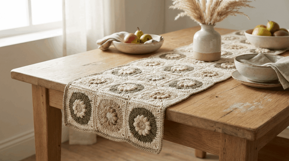 Um trilho de mesa em crochê já muda o clima da casa. Mas quando ele é feito com squares florais, acontece aquela virada de chave: a peça fica alinhada, simétrica e com cara de decoração bem pensada, porque o square dá estrutura e a flor entrega charme e textura. E o melhor: é um projeto modular, gostoso de repetir e fácil de ajustar ao tamanho da sua mesa.
