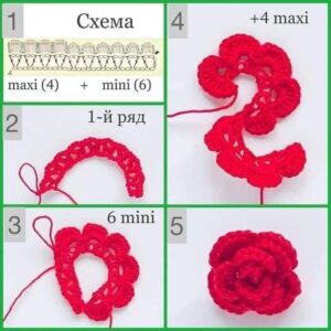 - Flor simples: ideal para iniciantes, feita apenas com correntinhas e pontos altos.