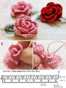 - Para as pétalas, faça 3 correntinhas, 2 pontos altos, 3 correntinhas, ponto baixíssimo no mesmo ponto de base.