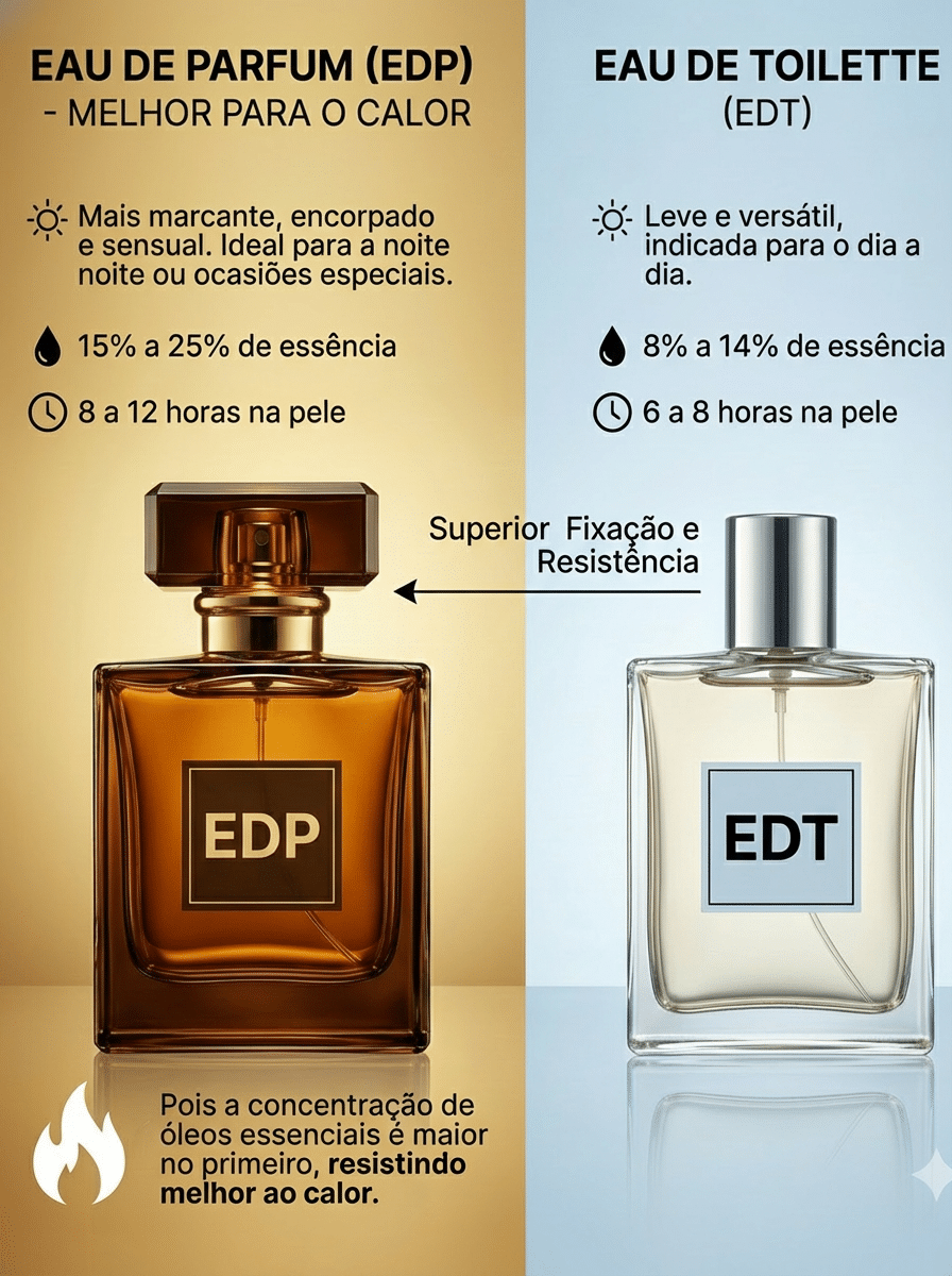 Outro ponto fundamental é a escolha da concentração correta da fragrância. No verão, embora os body splashes sejam refrescantes, eles evaporam rápido. Para garantir uma fixação do perfume duradoura, opte por Eau de Parfum (EDP) em vez de Eau de Toilette (EDT), pois a concentração de óleos essenciais é maior no primeiro, resistindo melhor ao calor.