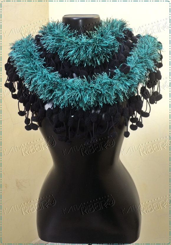 Esse modelo que vou mostrar hoje fiz inspirada numa peça que a minha querida Amiltis compartilhou no face ( aproveite e clique no nome dela para visitar e seguir seu blog que vale muito a pena, ela faz trabalhos maravilhosos) fiz algumas modificações, coloquei 3 carreiras de ponto alto com o fio Tyba da Purafibra sobre os pompons, fechei num círculo e transformei em gola, gostei do resultado final, pensei em algo e consegui fazer, ficou muito elegante, e você também pode usá la como cachecol, acompanhe abaixo, também vou deixar a receita e foto no qual me inspirei.