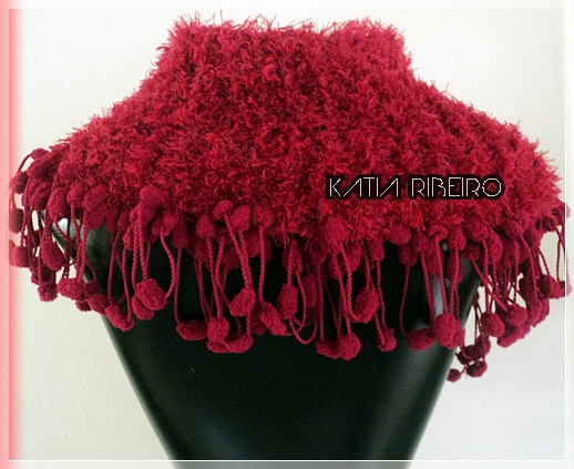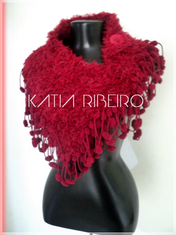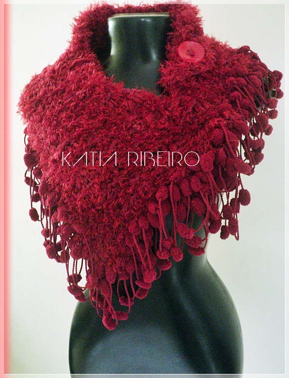 Essa gola fiz com o fio Lussuria da Lanafil misturado com um fio felpudo e outro pompom dando esta combinação muito legal e depois finalizei com um botão para dar um charme a mais … foram 11 ponto pontos tricô na agulha 9 por 70 cm , para o contorno fui crochetando de três em três pompons, , só isso, super fácil para iniciantes !!