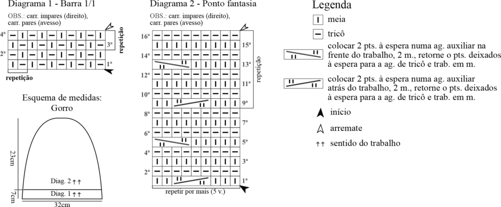 Nov.: novelo, p.: ponto, pts.: pontos, j.: juntos, m.: meia, t.: tricô, ag.: agulha, rep.: repetições, carr.: carreiras, seg.: seguinte, diag.: diagrama, dim.: diminuições ou diminuição, acomp.: acompanhando, comp.: comprimento, aprox..: aproximadamente.