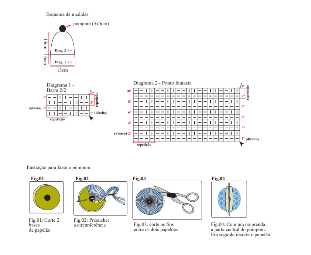 Para começar o seu gorro de tricô com pompom, primeiro confeccione o pompom conforme as instruções das figuras 1, 2, 3 e 4 no diagrama ilustrativo. Após finalizar, reserve o pompom para ser utilizado posteriormente.