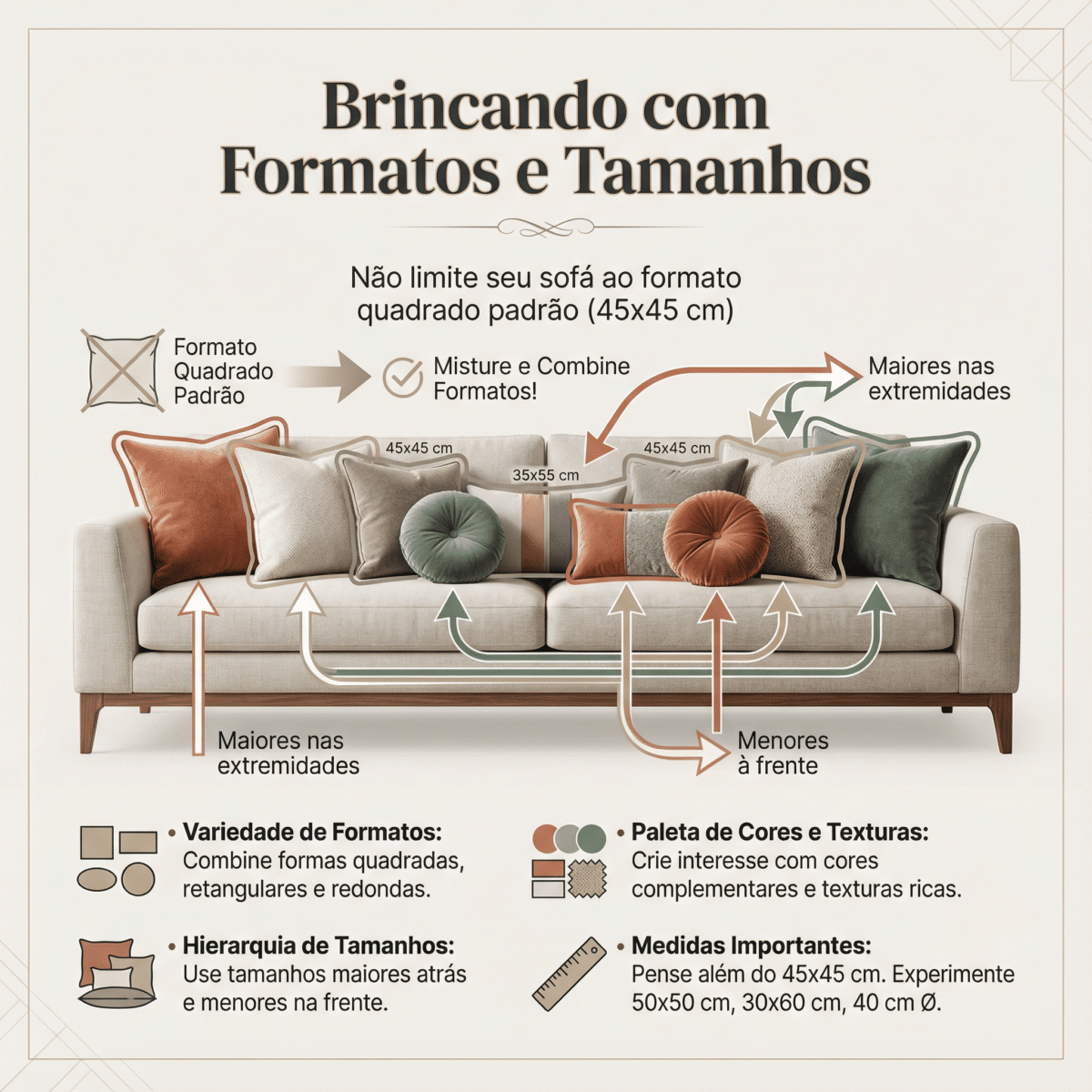 Não limite sua escolha apenas ao formato quadrado padrão (45×45 cm). Para uma composição dinâmica, misture tamanhos diferentes e inclua a almofada baguete (retangular) ou modelos redondos. Coloque as peças maiores nas extremidades do sofá e as menores à frente para criar uma hierarquia visual que guia o olhar.