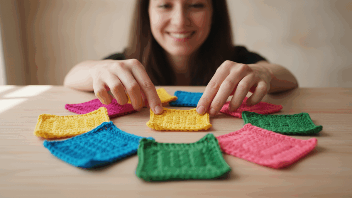 Comece com projetos simples, como porta-copos, sousplats ou quadradinhos (granny squares). Eles ajudam a treinar o controle da tensão do fio e a uniformidade dos pontos.