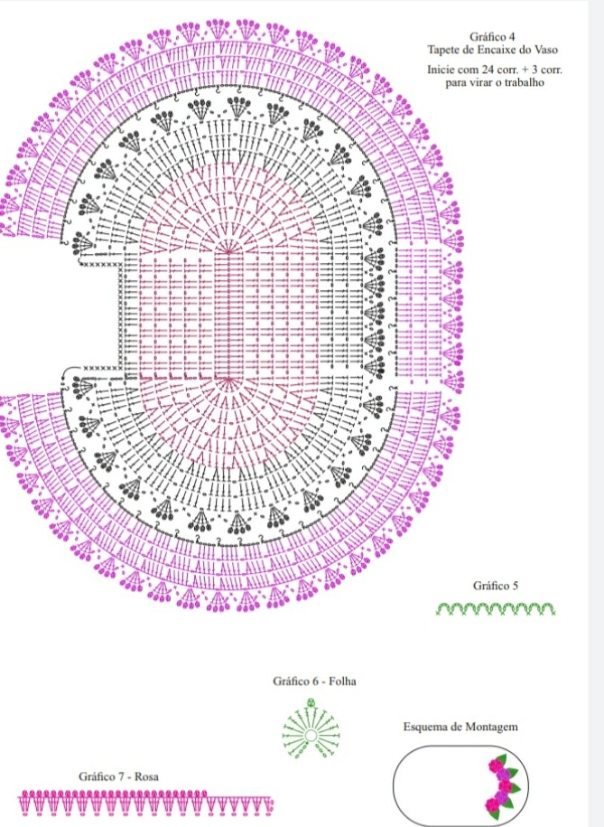 Continue conforme gráfico 4, trabalhando em carr. circulares e realizando as devidas trocas de cores. Feche com p.b.x. Arremate o fio.