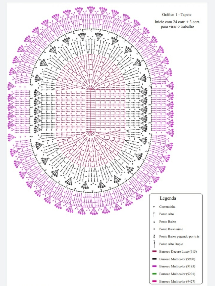 Continue conforme gráfico 1, trabalhando em carr. circulares e realizando as devidas trocas de cores. Feche com p.b.x. Arremate o fio.