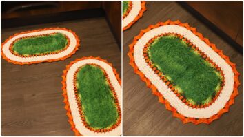 Já o tapete maior começa com um cordão de 89 correntinhas. As etapas repetem o esquema do modelo menor, mas com um número maior de repetições para acompanhar as dimensões diferenciadas. Ambos os tapetes são feitos em carreiras circulares, formando um desenho harmonioso que evidencia os detalhes coloridos ao longo das bordas e nos pontos altos cruzados.