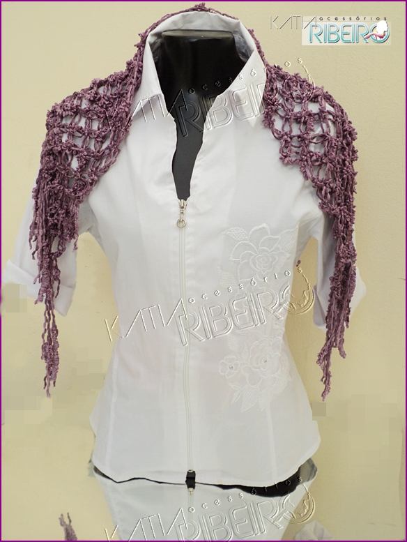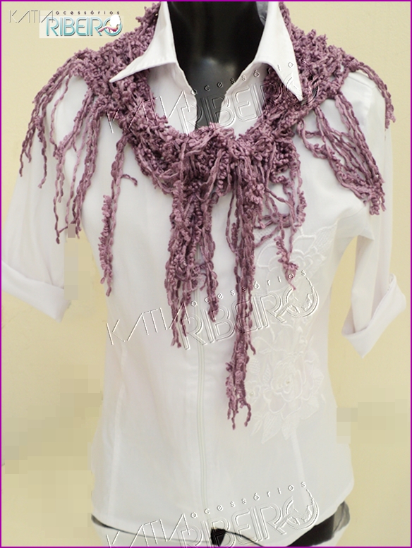 Este lenço é muito elegante, foi confeccionado em croche ( ponto segredo ) , seu fio se diferencia pelo contraste entre tom fosco com brilho na mesma cor – fio liso x pequenos blocos no tricô, em alto relevo – detalhe inovador entre as opções de acrílicos conferindo um fantástico efeito, além disso seu toque é muito suave. Cores sob consulta (conforme disponibilidade do fornecedor).