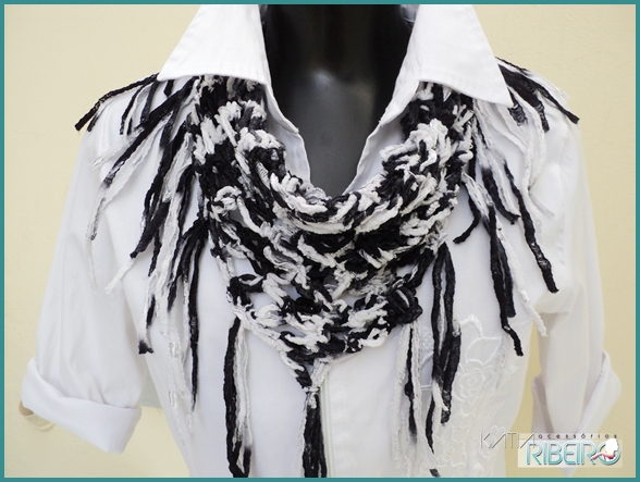 Este lenço é feito em crochê e o fio tem um leve toque de veludo misturado com um brilho discreto, em um produto tipo fita, tom sobre tom e suas franjas dão a ele um ar chic e despojado. Poderá ser feito em outras cores sob consulta.