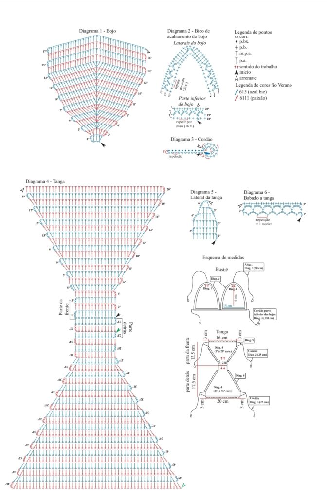Pontos utilizados no crochê: corr.: correntinha, p.bx.: ponto baixíssimo, p.b.: ponto baixo, m.p.a.: meio ponto alto, p.a.: ponto alto, bojo: siga o diag. 1, bico de acabamento do bojo: siga o diag. 2, cordão: siga o diag. 3, tanga: siga o diag. 4, lateral da tanga: siga o diag. 5, babado da tanga: siga o diag. 6.