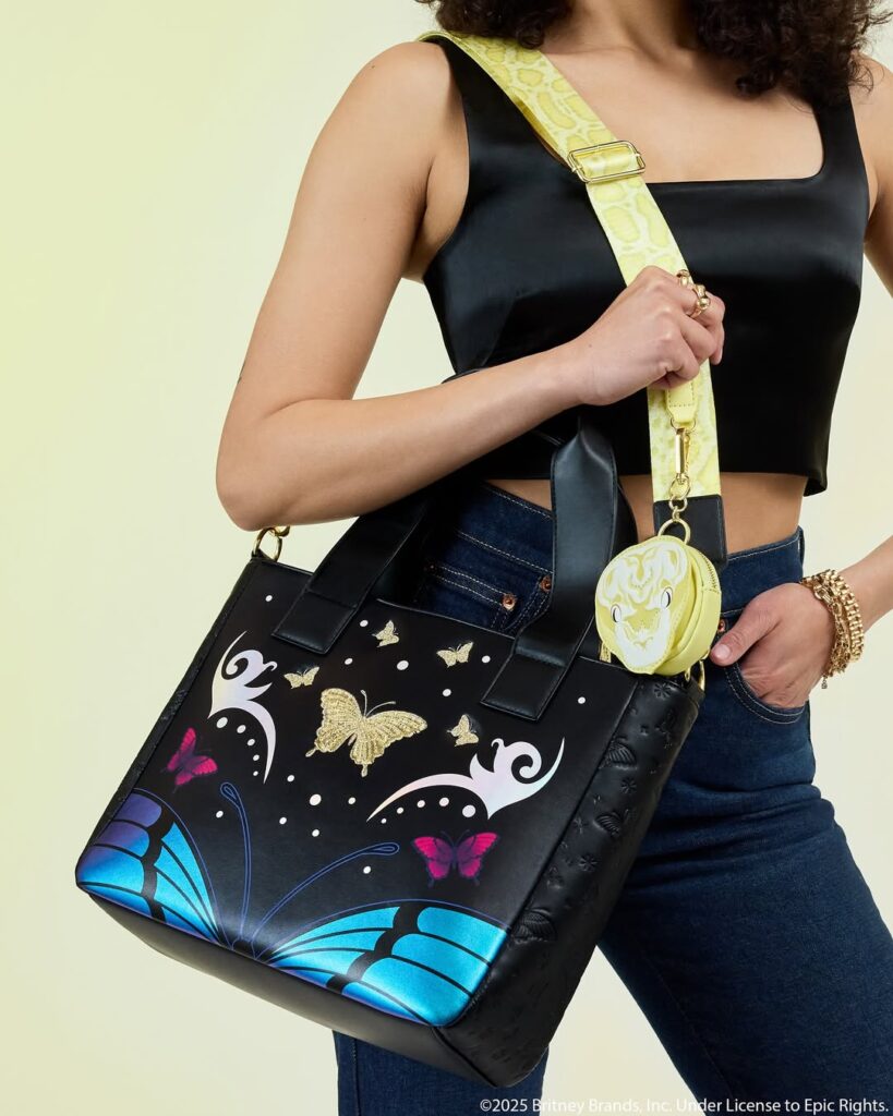 A coleção de bolsas da Loungefly inspirada em Britney Spears apresenta detalhes cuidadosamente elaborados que capturam a essência dos momentos mais memoráveis da carreira da artista. A tote bag “Butterfly” é adornada com borboletas e possui uma alça de crossbody com estampa de cobra, disponível por 75. Já o porta-cartões, que custa 25, exibe elementos de três eras distintas de Britney, tornando-se um item colecionável para os fãs.