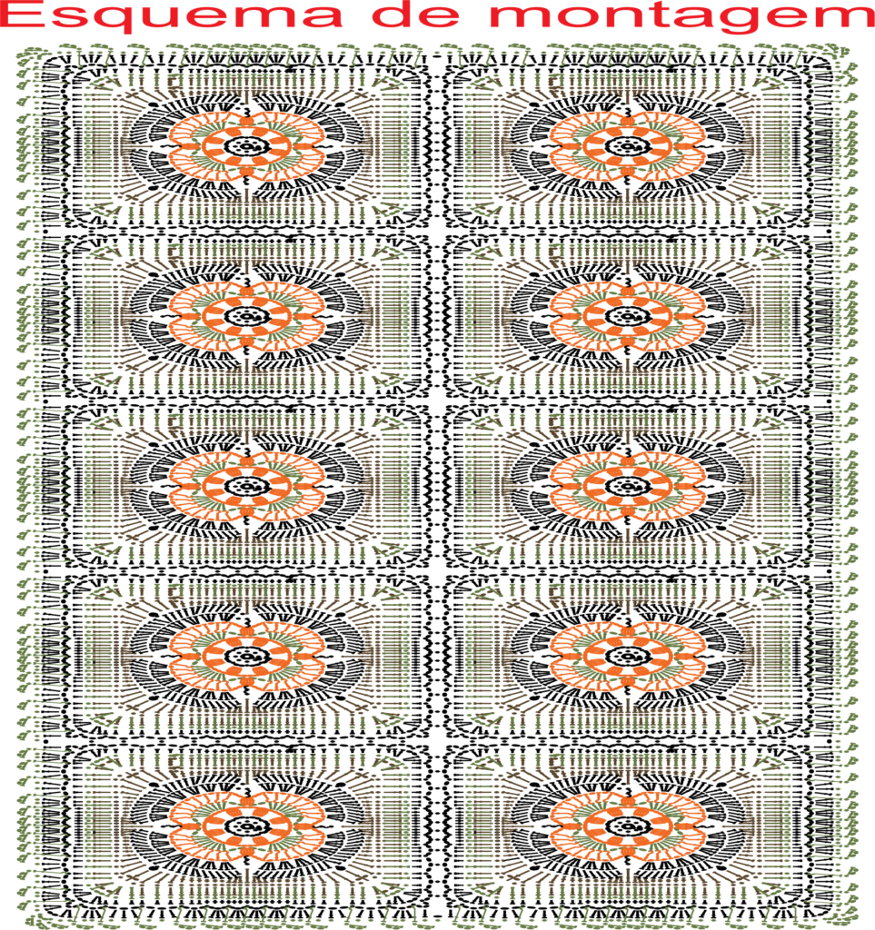Contorno: com o fio na cor cinza-chumbo, siga o gráfico 2 ao redor da manta. Faça as franjas nos lados menores, do seguinte modo: faça 1 p. bxmo. no p. de base, alongue a corr. que ficou na ag. por 40 cm, gire o fio 40x na ag., dobre a corr., faça 1 p. bxmo. no próximo p. de base e solte a corr.. Repita este processo várias vezes.