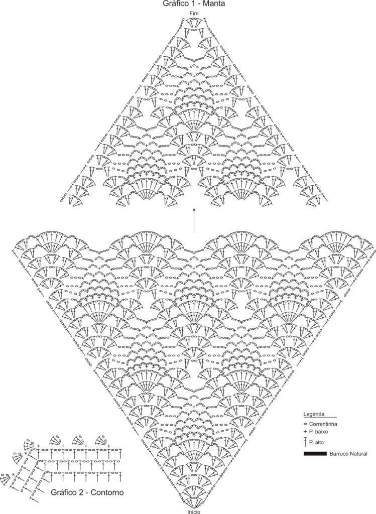 Confecção: com o fio na cor natural, fazer 4 correntinhas e seguir o gráfico 1. Ir aumentando até formarem 10 abacaxis e, depois, diminuir até restar 1 abacaxi. Contorno: com o fio na cor natural, fazer o contorno do gráfico 2 ao redor da manta. Artesã: Heloísa Mazoni
