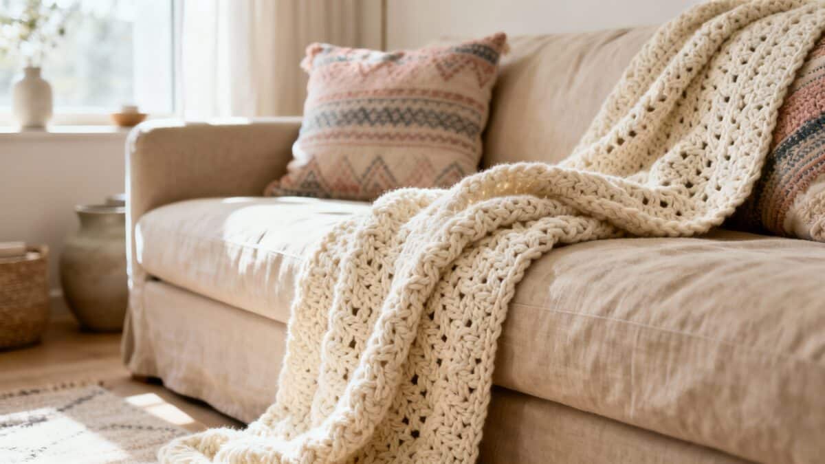 Dica extra: use tons neutros (bege, areia, cinza, off-white) com detalhes em crochê colorido para destacar a manta como peça decorativa.